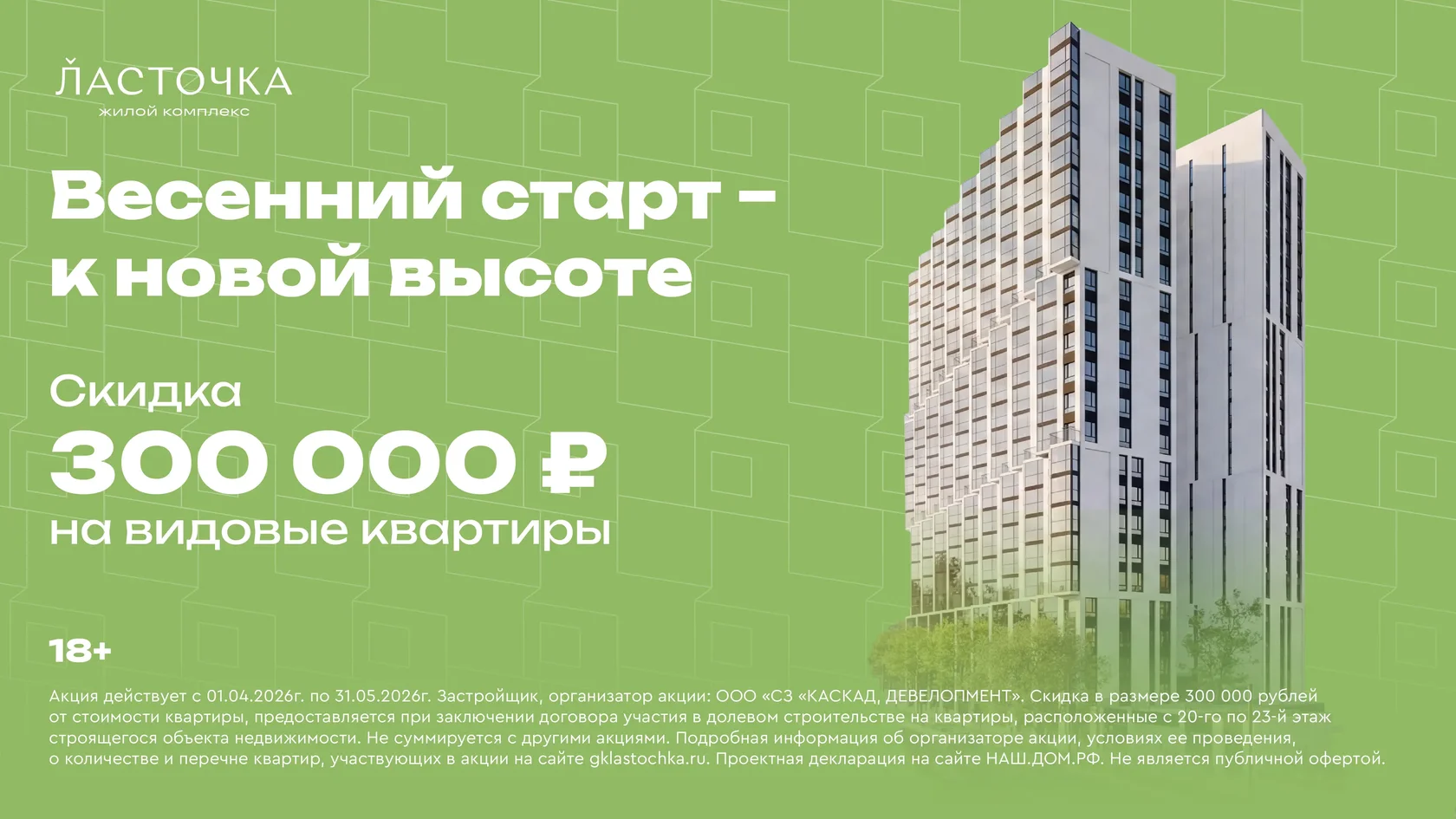 Жилой комплекс “Ласточка” объявляет старт продаж видовых квартир и запускает специальное предложение: при покупке с 1 апреля по 31 мая 2026 года предоставляется скидка 300 000 рублей.